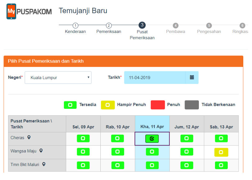 Pilih ‘Negeri’ dan ‘Tarikh’ yang inginkan untuk pemeriksaan. Kemudian, pilih tarikh and lokasi yang masih tersedia.