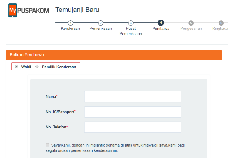 Lengkapkan butiran pembawa kenderaan yang akan hadir untuk pemeriksaan.